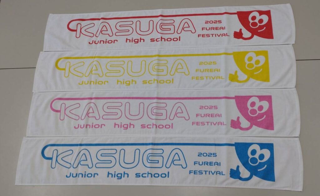 そして、先日ご応募していただきましたふれあい文化祭の記念品は、体育大会のクラスカラーを活かして今年もタオルにてデザインを生徒や保護者の方、先生方からも募集し作成しました。10月14日に子どもたちへ配布。沢山のご応募、ありがとうございました(^_^)/