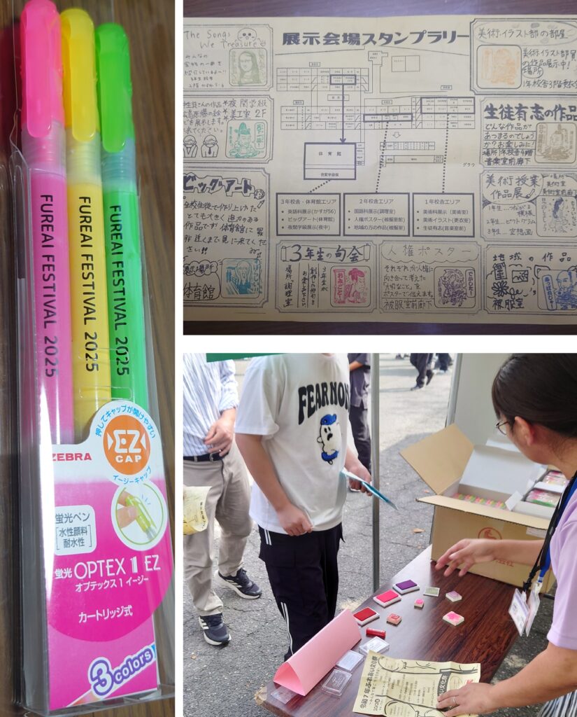 各学年校舎エリアに設置された複数のスポットを巡り、沢山の人がスタンプを集めて参加してくれました。スタンプラリーの景品は名入りの3色蛍光ペンを配りました。